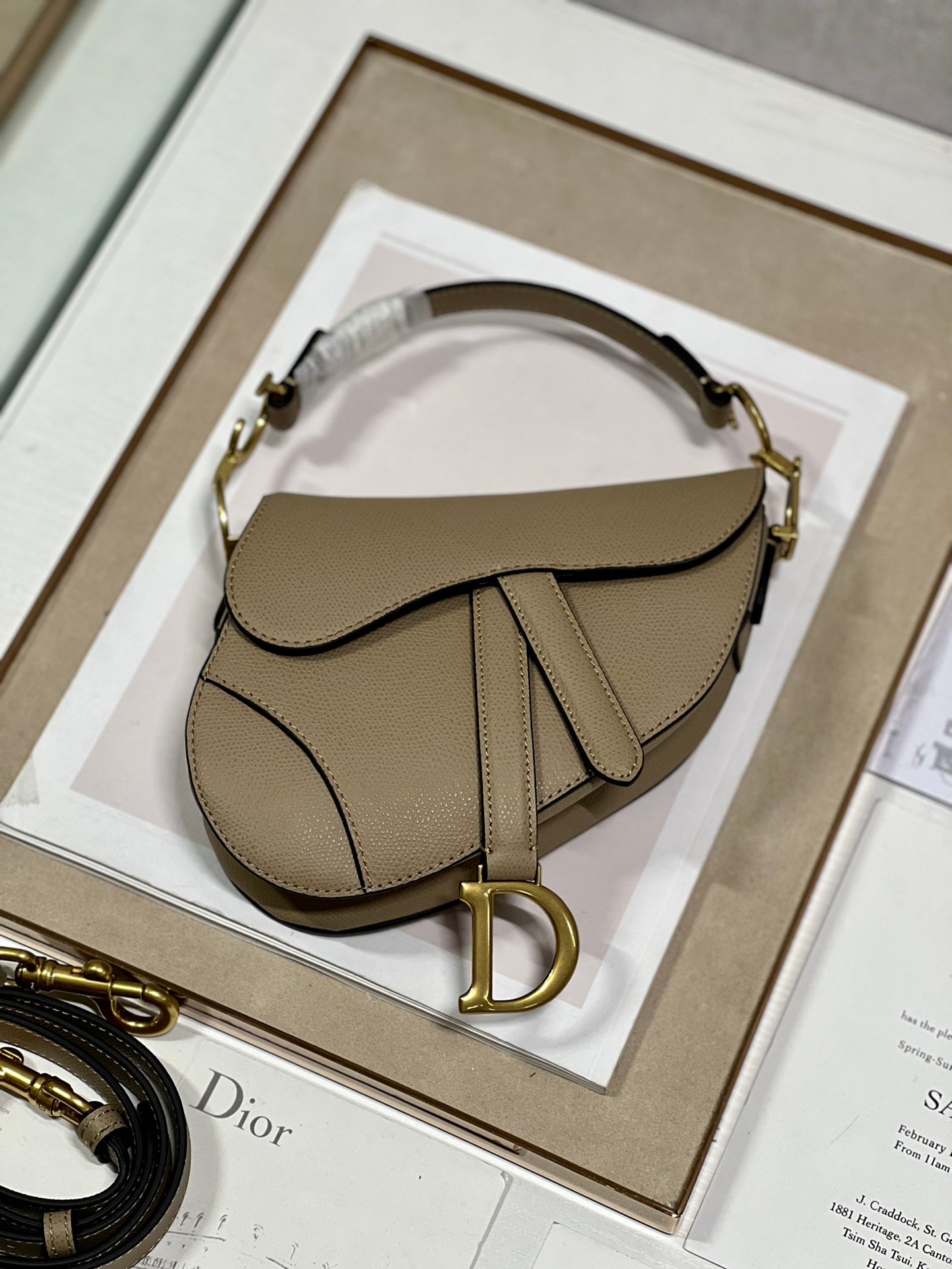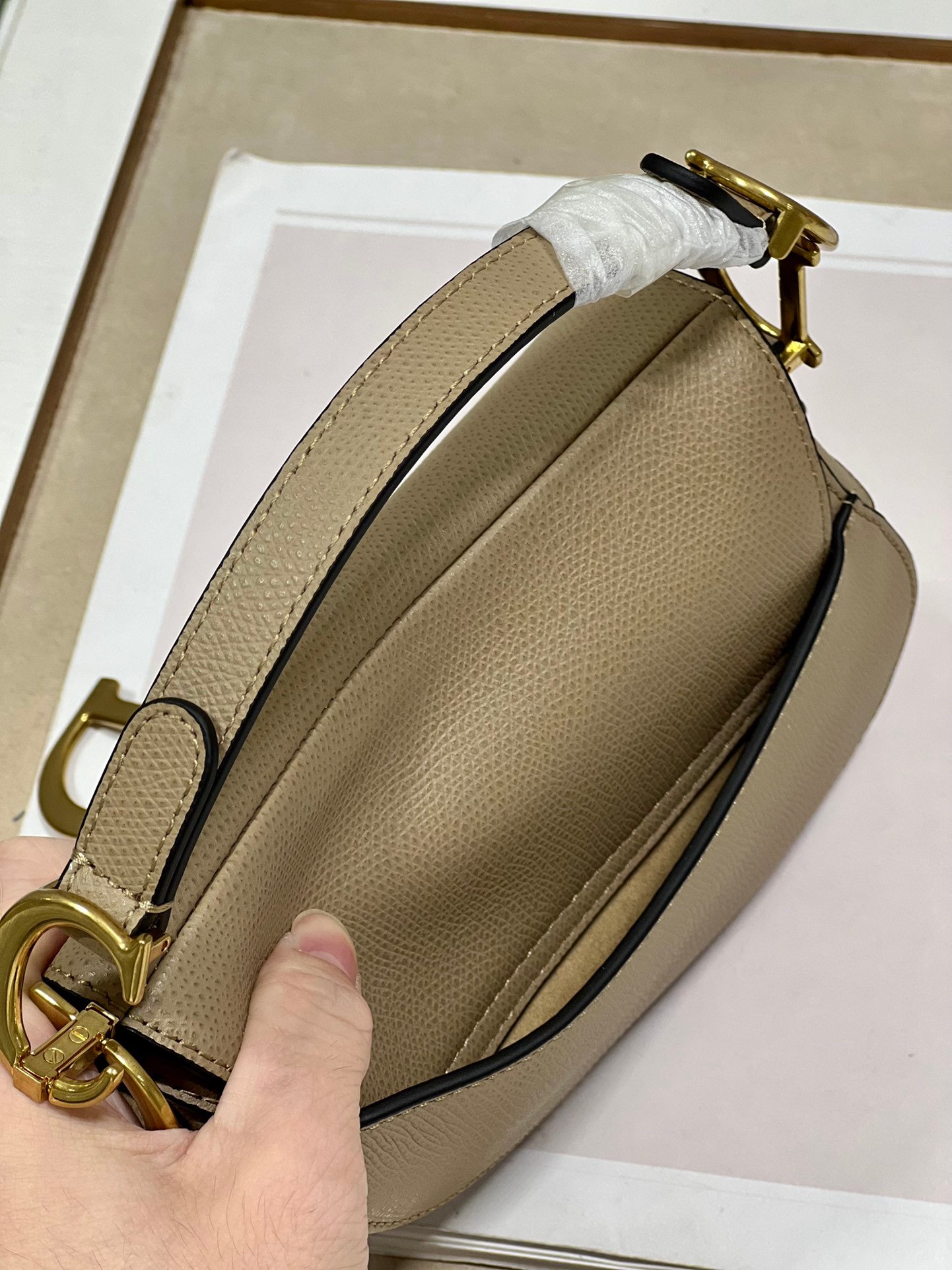 Christian Dior Saddle Bag with Strap Powder Beige Grained Calfskin